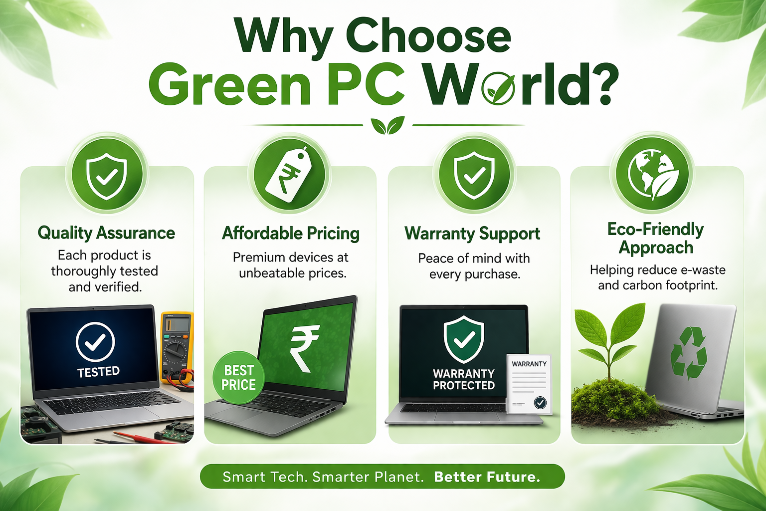 Green PC World is a trusted name in the refurbished electronics industry in India. We are a team of experienced professionals passionate about technology and sustainability. Our goal is to provide budget-friendly laptops for students, professionals, and businesses while reducing electronic waste.