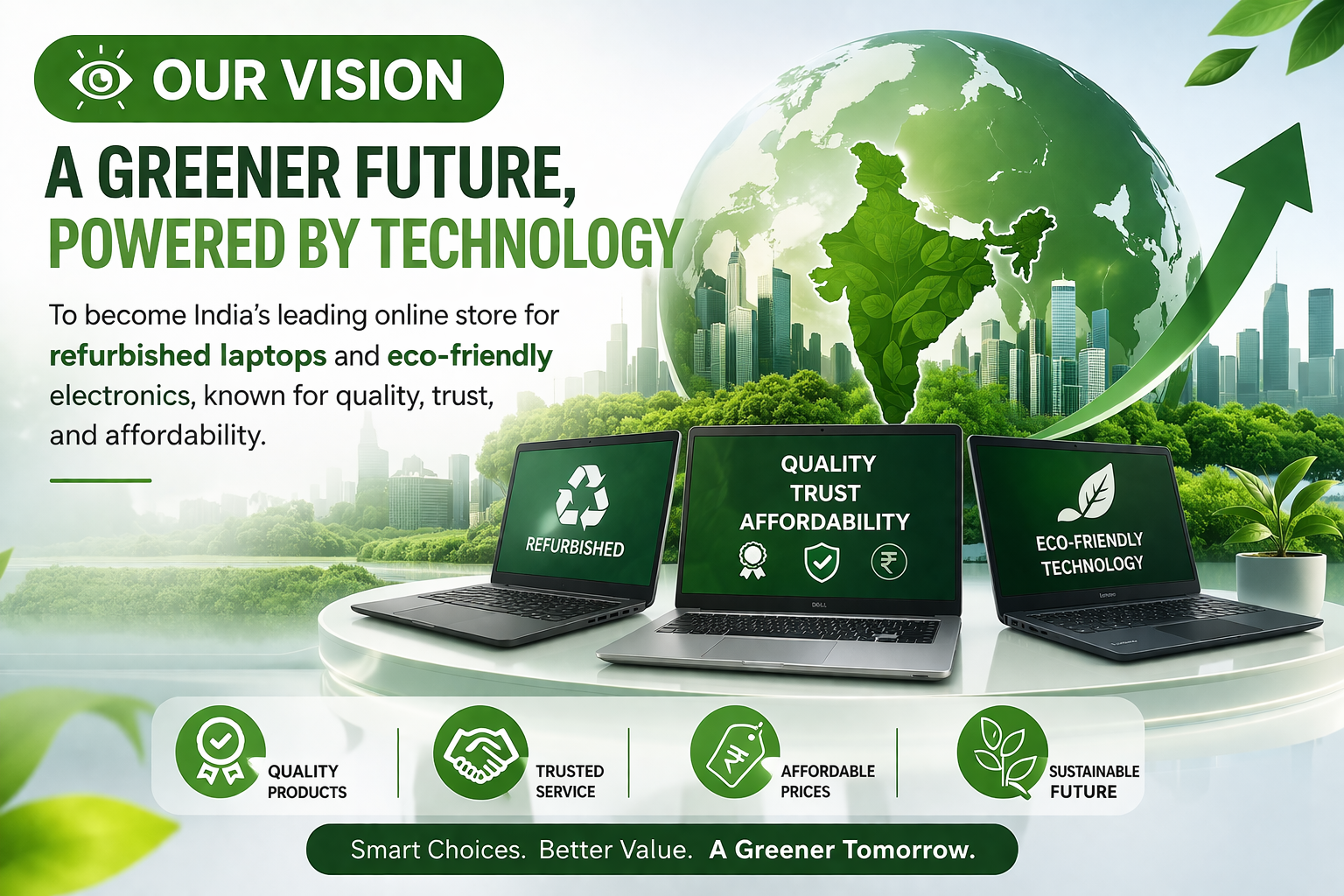 To become India’s leading online store for refurbished laptops and eco-friendly electronics, known for quality, trust, and affordability.